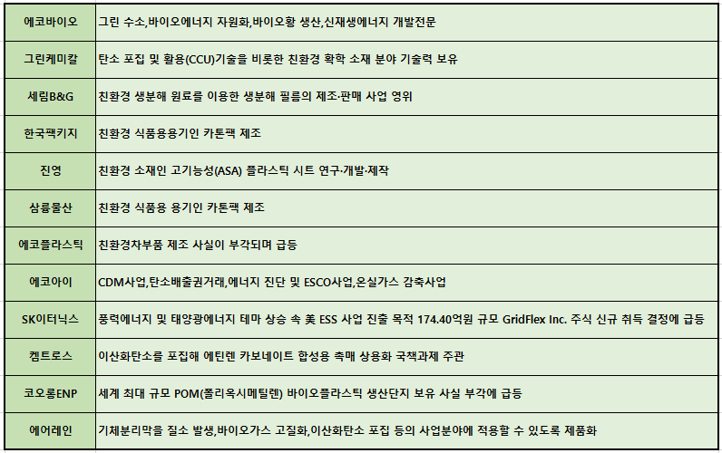 탄소배출 관련 산업군은 매우 다양합니다. 대표적으로는 탄소배출권 사업, 탄소포집 및 저장(CCUS), 친환경 플라스틱 산업 등이 있습니다.
